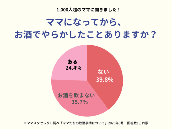 アンケートの結果によると、お酒の席でやらかしたことが「ある」と回答した人は24.4%となりました。一方で「ない(お酒は飲むが失敗したことはない)」と回答した人は39.8%、「お酒を飲まない」は35.7%という結果に。産後に飲酒を再開し、思わぬ失敗を経験したママは少なくないことがわかります。
