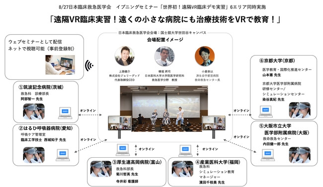 本セミナーでは、これまでジョリーグッドが医療VRの開発を共同で行ってきた、日本医科大学の横堀將司教授と、ECMOの第一人者である済生会宇都宮病院 救命救急センター長、小倉崇以先生らが講師となり、会場である国士舘大学と、愛知・大阪・京都・福岡・茨城・富山の病院7拠点の医師・看護師らがオンラインとVRで臨床実習する、新しい医療セミナーのカタチを実証します。
