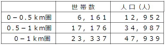・店舗から1㎞圏内は、単身世帯比率が43.3%、2人世帯が25.5%と全体の7割弱が少人数世帯です。