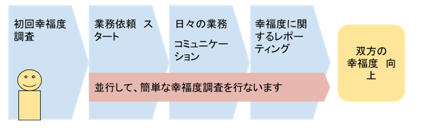 業務を遂行する担当が決まると、まず、業務の委託側・受託側の双方で幸福度調査を行います。