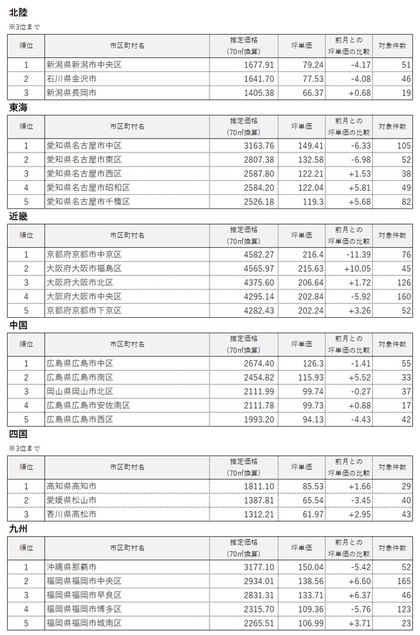 各エリア5位まで。ただし、「北陸」「四国」は対象件数が15件未満の市区町村が多いため3位までの掲載。