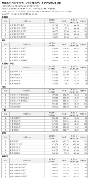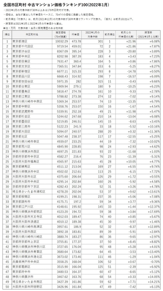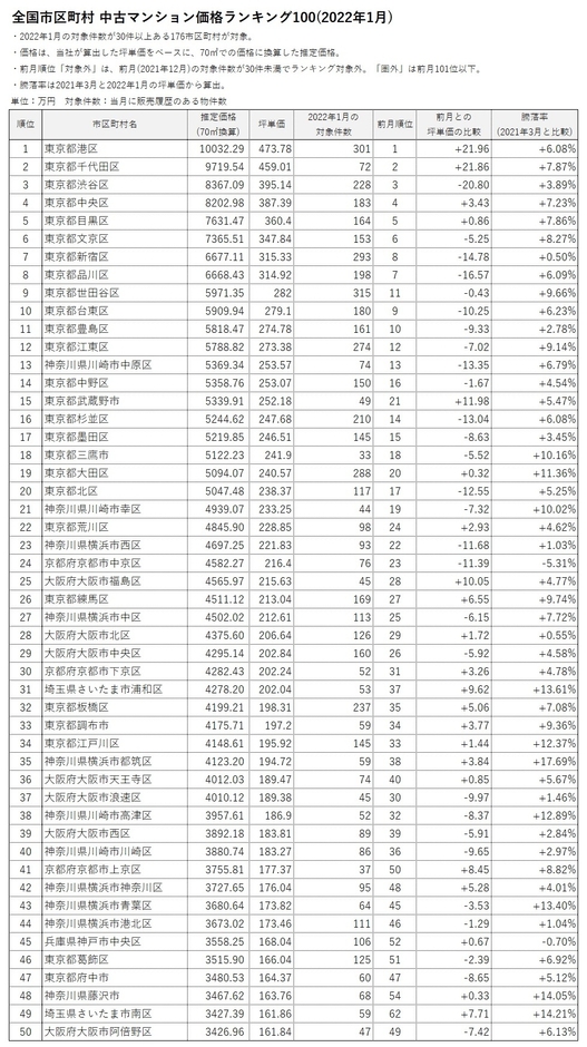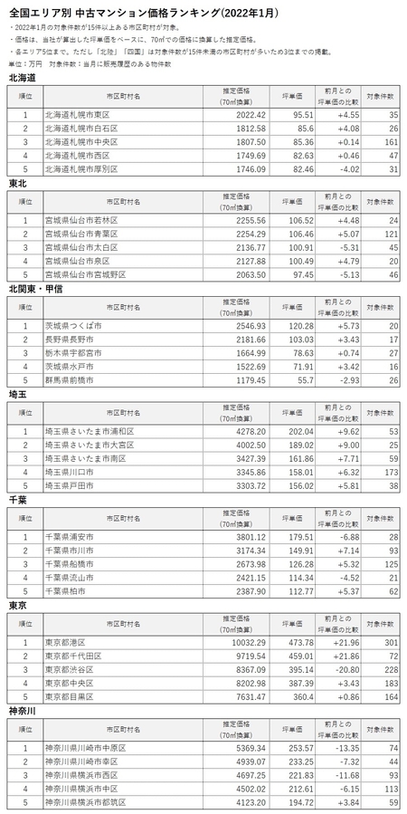 「マンションレビュー」2022年1月 全国市区町村 中古マンション価格ランキング100を発表