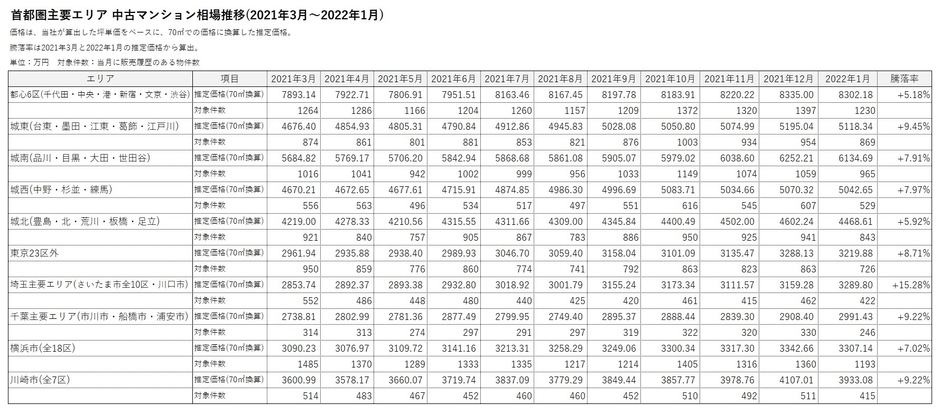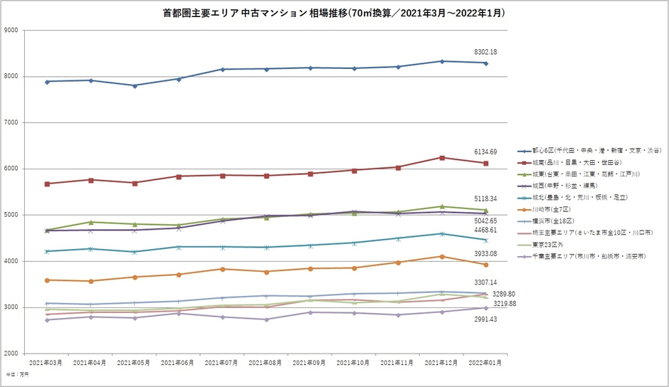■主要エリア 中古マンション相場推移(2021年3月~2022年1月)