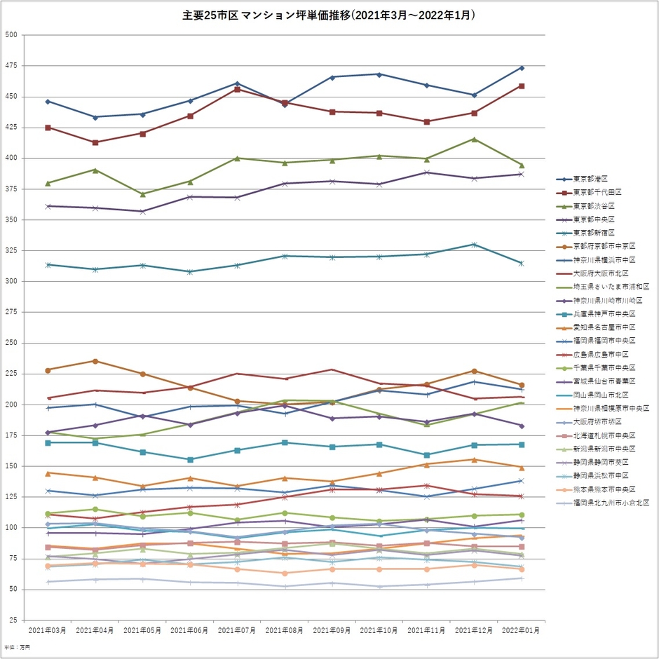 ■主要25市区 マンション坪単価推移(2021年3月~2022年1月)
