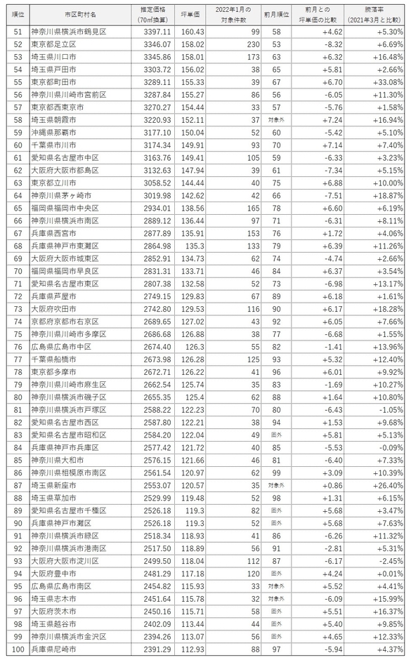 当社が保有する中古マンションの販売履歴データを元に「坪単価」を算出し、70㎡での価格に換算した「推定価格」によるランキング。2022年1月の対象件数(当月に販売履歴のある物件数)が30件以上ある全国176市区から、トップ100を掲載。