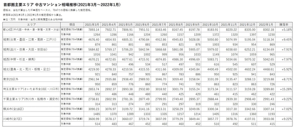 ・首都圏の主要エリアでの2022年1月の推定価格は、「埼玉主要エリア(さいたま市全10区・川口市)」「千葉主要エリア(市川市・船橋市・浦安市)」を除き、2021年12月より下落。東京都内は全エリアで下落した。