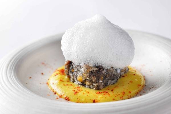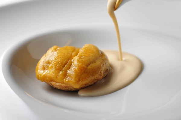 青森県南部地方の中でも太平洋沿岸部に伝わる郷土料理「いちご煮」をフランス料理にアレンジしました。通常はお吸い物として登場するいちご煮ですが、貝出汁をベースにした濃厚で、磯の香りが凝縮されたソースを合わせました。一番上は人肌にあたためた雲丹を乗せ、タルト生地の中には肝で和えた鮑の身を使用しました。凝縮された貝出汁の旨味と磯の香りを堪能できる一皿です。