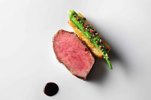 牛肉を炭火でじっくりと焼き上げ、ジャガイモと、ヒバの香りを纏った旬のオクラを添えた一皿です。牛肉にはマデラ酒をふんだんに使用したソースを合わせました。柔らかくなるまでしっとりと火を入れたオクラは、ジャガイモの食感とぴったりと調和します。肉の熟成感、炭火の香り、ヒバの香りが重なり合い、複雑な香りと味わいを楽しめます。