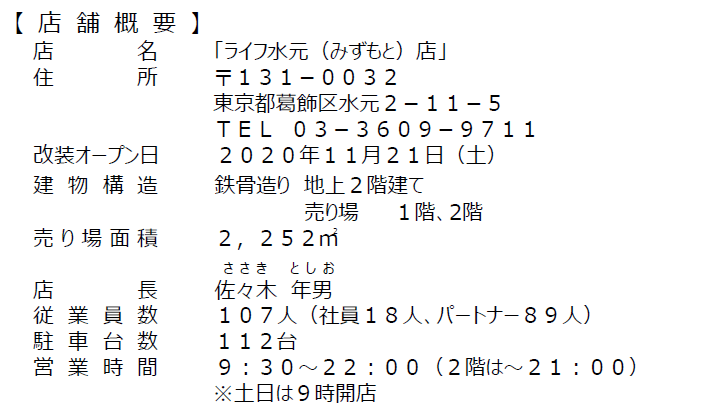 “おいしい” “ワクワク” “ハッピー” をお届けするライフコーポレーションは、2000年11月8日に開店して以来、多くのお客様にご愛顧いただいております「ライフ水元店」を、本日2020年11月21日(土)に改装オープンいたしました。