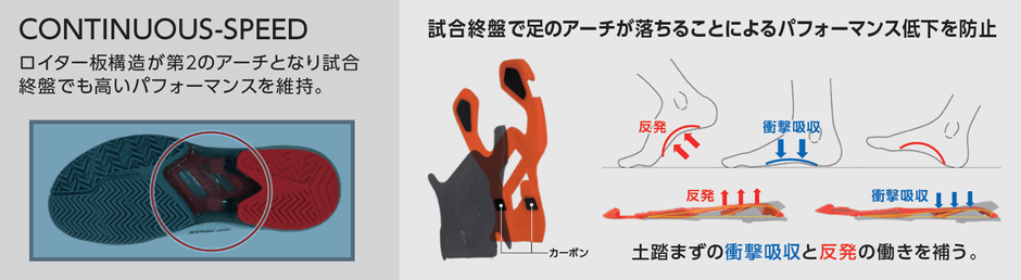 2つ目は「切り返し」。新設計のTPUシャンク構造が足のねじれをコントロールし、より速い切り返しを実現します。3つ目は「スピードの維持」。ロイター板構造が土踏まずの衝撃吸収と反発を補うことでフットワークが安定し、試合終盤でも高いパフォーマンスを維持します。