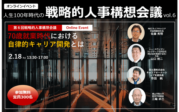 主にミドル・シニア層を中心とした「自律的キャリア開発」の取り組みについて、実践企業の3社(電通ニューホライズンコレクティブ、NEC、富士通(※敬称略、五十音順))に事例をもとにご講演いただきます。 後半では、70歳就業時代における「自律型キャリア開発」をテーマに長年、ミドル・シニア層のキャリア開発の研究に取り組まれている桃山学院大学 経営学部 三輪卓己教授をゲストにお迎えし、パネルディスカッションを行います。