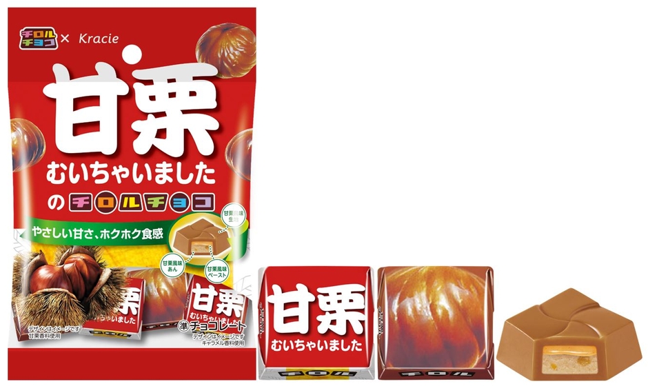 チロルチョコからは、「甘栗むいちゃいました」の味わいをそのままに、やさしい甘さとホクホク食感を再現した「チロルチョコ〈甘栗むいちゃいました〉」を発売します。