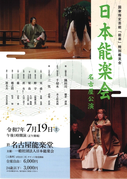 一般社団法人日本能楽会主催、国家指定芸能「能楽」特別鑑賞会 日本能楽会・名古屋公演が2025年7月19日 (土)に名古屋能楽堂(愛知県 名古屋市中区 三の丸 一丁目1番1号)にて上演されます。