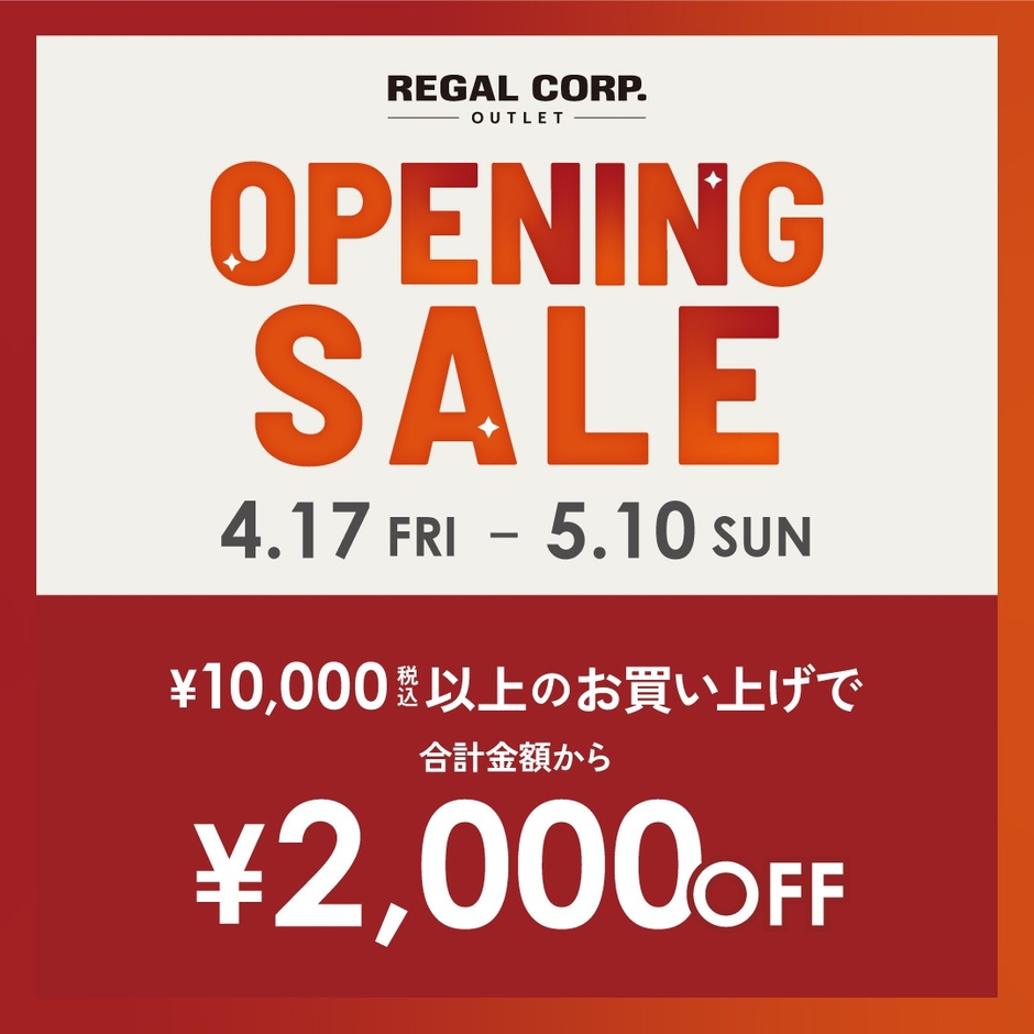 オープンを記念いたしまして、5月10日(日)まで10,000円(税込)以上お買い上げで2,000円OFFとなるオープニングセールを開催いたします。ぜひ、お近くにお越しの際は、リーガルコーポレーションアウトレット那須ガーデンアウトレット店へお立ち寄りください。