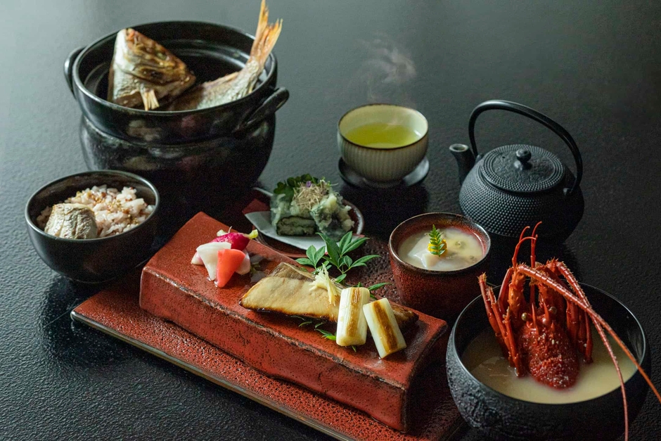 鯛めし、鮑の茶碗蒸し、鰤の照り焼き、伊勢えびの味噌汁、子持ち昆布の天ぷら