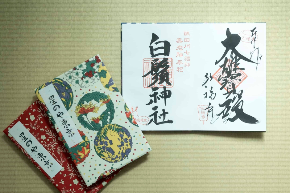 江戸の頃より七つの福運にあやかり、新しい年が良い年になるようにと願い、人々に親しまれていた七福神巡り。江戸文化年間に開闢(かいびゃく)された隅田川七福神を人力車で巡ります。開放的な人力車は、普段とは違った目線で街の眺めを楽しむことができます。東京の歴史や地理を知り尽くした車夫とともに各寺社をまわり参拝し、御朱印を集めます。使用する御朱印帳は、創業文化三年、日本橋にある老舗和紙舗榛原の和紙を使用し、前日に自分で作成したオリジナルのものです。隅田川七福神を巡ることで、より不安がない状態で新しい年を迎えることを期待します。