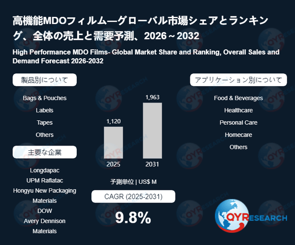 QYResearchが発表した新たな市場調査レポート「高機能MDOフィルム―グローバル市場シェアとランキング、全体の売上と需要予測、2026~2032」によると、世界の高機能MDOフィルム市場規模は2024年の約1029百万米ドルから2025年の1120百万米ドルへと順調に拡大すると見込まれ、予測期間中は年平均成長率(CAGR)9.8%で成長し、2031年には1963百万米ドルに達すると予測されている。
