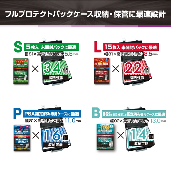 フルプロテクトパックケースのSサイズ、Lサイズ、PSAサイズ、BGSサイズと4サイズ全て対応しています。