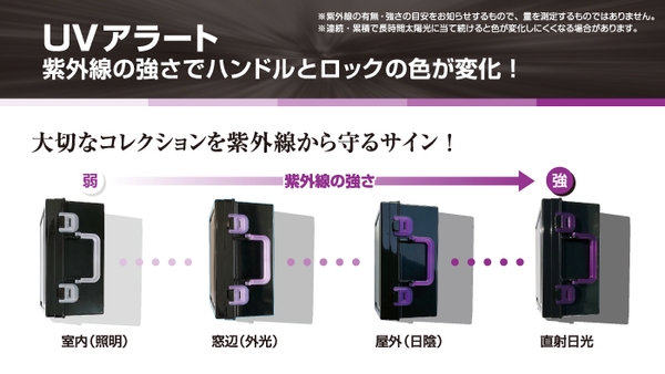ハンドルとロック部分の色が変化することで、コレクションの色褪せの原因になる紫外線を随時チェックすることが可能です。