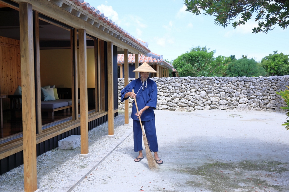 竹富島では、集落に敷かれた珊瑚の白砂に竹箒で箒目をつけることが朝の習慣です。箒目つけには、道を掃き清め、魔を祓うという意味があります。2日目は、観光客の少ない朝の静かな集落を散歩しながら島民が箒目をつけている様子を見学し、3日目には自ら客室の庭に箒目をつけます。朝の穏やかな日射しのもと集中して箒目をつけ、心身も清められる体験です。