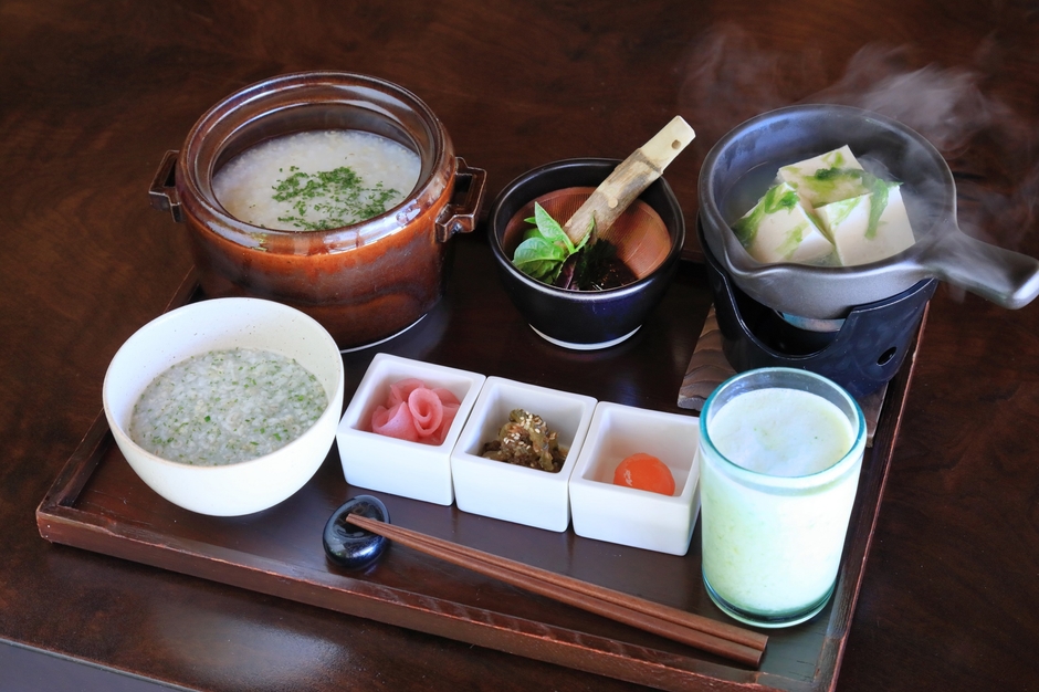 箒目つけで掃き清めた庭を眺めながら楽しむ3日目の朝食は、島で昔から健康を保つために食べられてきたハーブである命草を使ったお粥や、大豆の濃厚な風味が感じられる島豆腐の湯豆腐です。