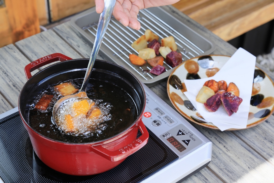 1日目に収穫した芋で作るのは、竹富島で親しみのあるお菓子「デンガク」です。土壌が痩せていても収穫しやすかった芋は、様々な工夫を凝らして食べられていました。油で揚げた芋に砂糖をまぶしたシンプルな作り方は、芋本来の甘みが感じられ、素朴ながらも素材のもつ豊かさを感じることができます。