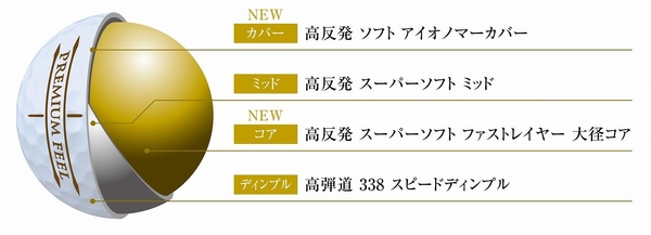 NEW「ゼクシオ プレミアム」は、新開発「高反発 スーパーソフト ファストレイヤー 大径コア」と「高反発 ソフト アイオノマーカバー」により高初速化を実現しました。また、ソフト化したコアにより、低ヘッドスピードでも、ボールがしっかりつぶれ、高打ち出し低スピンとなり、さらに大きく、まっすぐな飛びを体感できます。