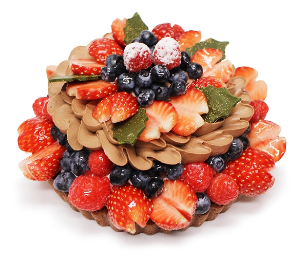 甘酸っぱいいちごとベリーをチョコレートクリームと合わせて、ビターチョコレートに飾り付けた、見た目にも可愛いケーキです。