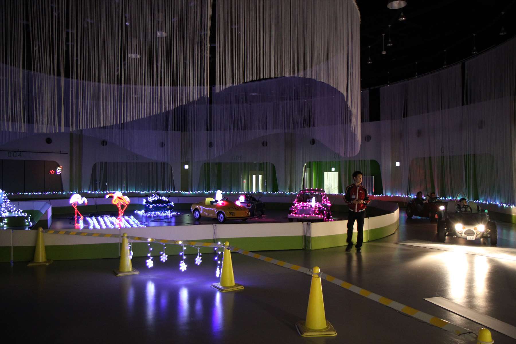 このイベントは、イルミネーションで幻想的に演出したライドスタジオ特設コースを、3人乗り電気自動車「カマッテ」と1人乗り電気自動車「ピウス」にて走行できます。 今回は花火や浮き輪、スイカなど夏を感じさせる電飾や装飾を増やし、子供たちの夏休み気分をさらに盛り上げます。