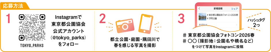 応募は簡単です。東京都公園協会の公式Instagramアカウント「@tokyo_parks」をフォローし、指定の2つのハッシュタグ(「#東京都公園協会フォトコン2026春」、「#〇〇(撮影地の公園名や橋名など)」)をつけて、都立公園・庭園、隅田川で撮影した写真をInstagramに投稿するだけです。