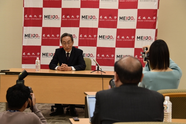 講演会に先立って地元メディアとの懇談会も行われ、4社のメディアが集まりました。大野特任教授が切り拓いた「スピントロニクス」関連の質問では「この技術を使うとスマートウォッチは2週間充電なしで使用できる」と紹介し、本学の赤﨑勇特別栄誉教授とは自身が修士課程時代から面識があったと話し、「修士の学生だった私にも対等に接していただき、研究者としても、人としても尊敬している」と思い出を語りました。