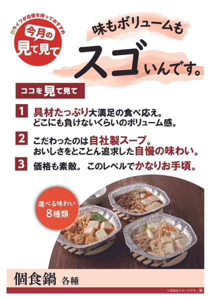毎年ご好評をいただいている「個食鍋」を、新商品を加えてリニューアルいたしました。シニア層のお客様に人気の商品ですが、幅広い年齢層のお客様にお召し上がりいただけるよう、「ごま豆乳鍋」を新しく開発しています。必要な食材が1人前サイズですべてそろっているので、単身世帯やお仕事や家事・育児で忙しい共働き世帯の方にもぜひおすすめしたい商品です。選べる8種類でご用意しておりますので、ぜひお好みの味をお探しください!