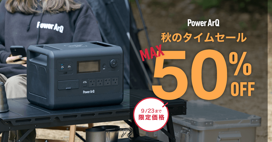 アウトドアだけでなく、災害対策グッズとしても人気の「PowerArQ(パワーアーク)」(加島商事株式会社)は、公式サイトにて秋のタイムセールを開催いたします。今回のセールでは人気のポータブル電源やポータブル冷蔵庫をはじめ、セール初登場の発電機やスマホホルダーなども対象。お得なこの機会を是非お見逃しなく!