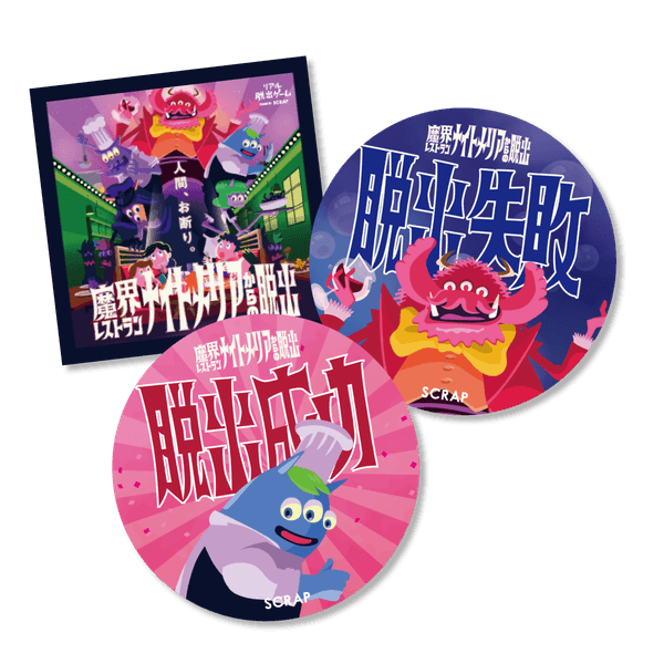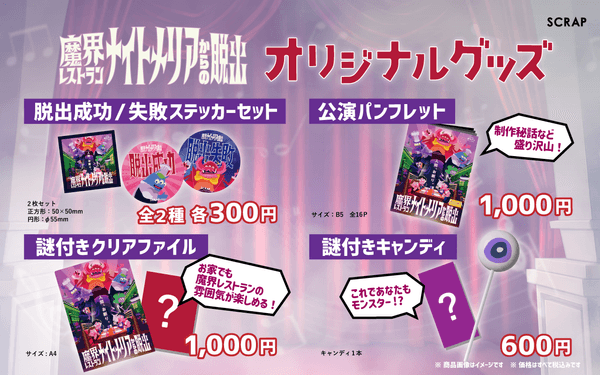 今回、本イベントの開催を記念して、オリジナルグッズの販売が決定!リアル脱出ゲームでは定番の「脱出成功/失敗ステッカーセット」をはじめ、公演の解説や制作秘話が詰め込まれた「公演パンフレット」や、イベント参加後にもさらなる謎解きが楽しめる「謎付きクリアファイル」など、自宅でもじっくりと魔界のレストランでの体験を思い出していただけるようなグッズを多数ご用意しました。また、公演中に登場するモンスターの目玉をモチーフとした「謎付きキャンディー」もオススメ。ぜひ、イベント参加後に各種オリジナルグッズをお買い求めの上、お楽しみください。