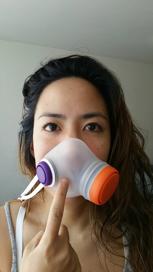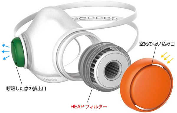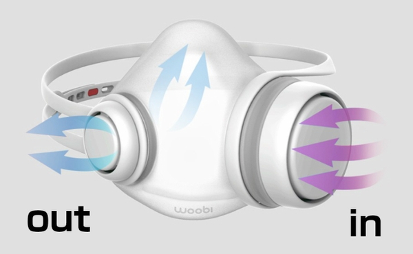 Woobiの呼吸システムの最大の特徴は大気中の細菌や汚染物質をろ過して綺麗な空気を体に取り入れるために、空気の吸い込み口と、呼吸した息を吐き出す排出口を別々にしている点です。