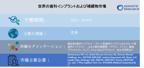 リサーチ・ネスターの一部門であるケネス・リサーチは最近、2021年12月13日に世界の歯科インプラントおよび補綴物市場の予測評価を提供する調査レポートを発表しました。世界の歯科インプラントおよび補綴物市場における成長ドライバー、市場機会、課題、脅威など、いくつかの主要な市場ダイナミクスを強調しています。