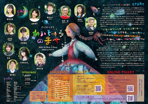 いつものように中学生以下無料はもちろん、そしてワクチンを接種できない小さいお子様にも安心してご覧頂けるよう、客席数を半分にしてお届け致します。更に、配信公演もご用意致しました。さぁ、誰もがあたたかくなるノックノックスの音楽劇「かいじゅうのまち」ぜひぜひご覧くださいませませ!