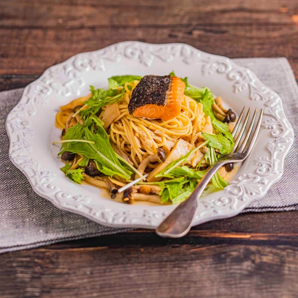 しっとりした身質の信州サーモンをグリルし、香りの良い白あわび茸、コリコリした食感の黒あわび茸、旨みの強いしめじと合わせました。焦がしバターがアクセント。