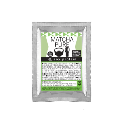 【MATCHA PURE(抹茶ピュア)】は、厳選した宇治抹茶を配合した人工甘味料不使用のソイプロテインです。