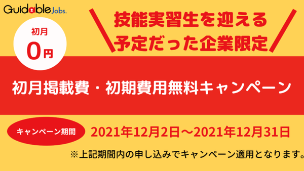 Guidable株式会社(本社:東京都新宿区、代表取締役:田邉 政喜、以下Guidable)は、政府が実施している外国人入国禁止の措置を受け、予定していた技能実習生の受け入れが困難になった企業を対象に、すでに国内に在留している外国人労働者の採用を支援する「初月掲載費・初期費用無料キャンペーン」を、2021年12月2日(木)より提供します。