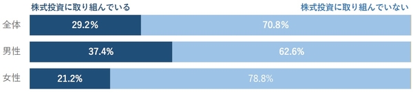 全国の20代〜70代の男⼥10,000名に対するアンケート調査の結果、株式投資に取り組んでいる⼈の割合は29.2%となり、およそ3割の⼈が株式投資に取り組んでいる実態がわかりました。なお、この回答には投資信託や上場投資信託(ETF)に取り組んでいる⽅も含まれています。