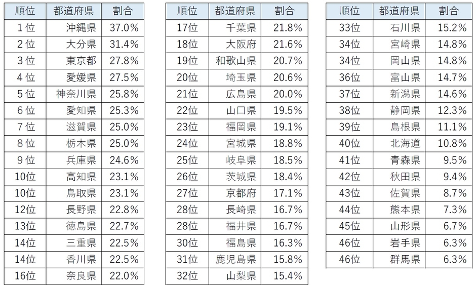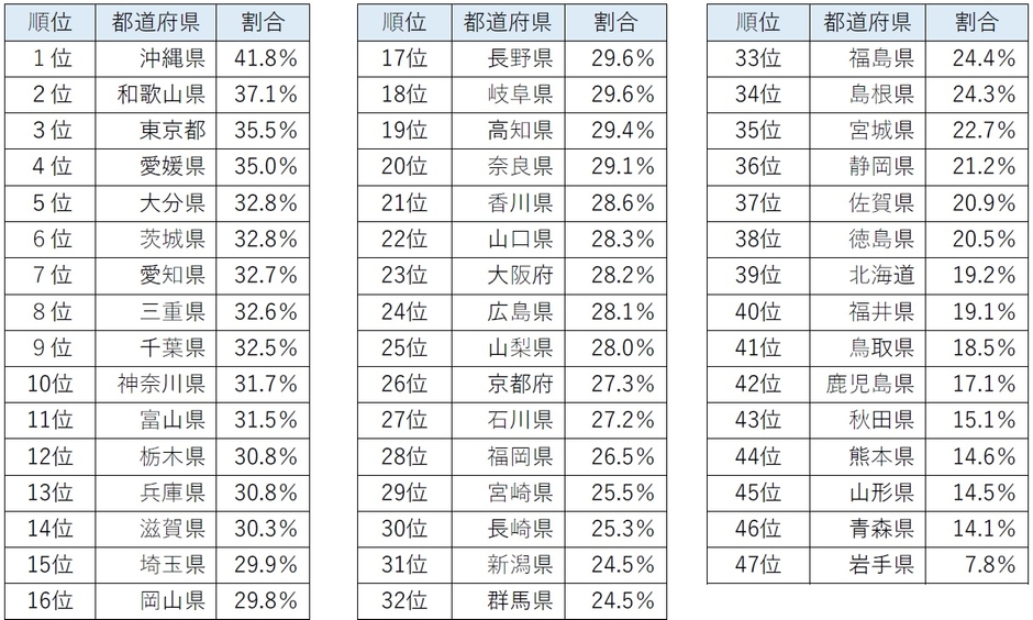 3⼤都市圏で⾒ると、東京都の3位(35.5%)、愛知県の7位(32.7%)、千葉県の9位(32.5%)、神奈川県の10位(31.7%)までがトップ10にランクイン。そのほか、⼤阪府は23位(28.2%)、福岡県は28位(26.5%)、宮城県は35位(22.7%)などとなっています。
