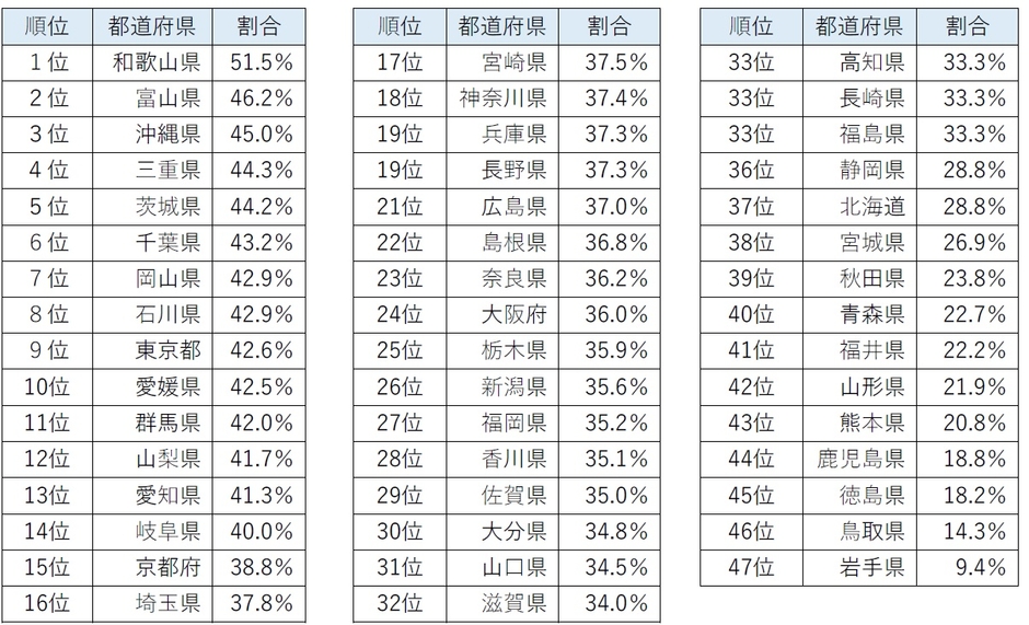 男性に絞った数字で⾒てみると、最も⾼かったのは和歌⼭県で、その割合は51.5%と、唯⼀5割を超えました。第2位の富⼭県も46.2%、第3位には全体1位だった沖縄県の45.0%が⼊り、いずれも⾼い数値を⽰しています。なお、全体3位の東京都は9位まで順位を下げる結果となりました。