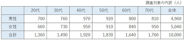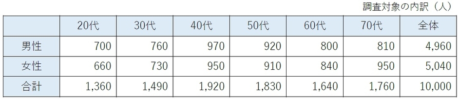 - 調査対象:全国20代〜70代の男⼥10,000名