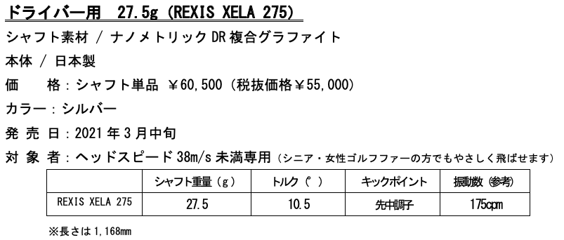 世界最軽量※1を更新!わずか27.5gのゴルフシャフト 驚きの軽さと高強度・高反発を両立した NEW「REXIS XELA(レクシス キセラ)」 2021年3月中旬より発売