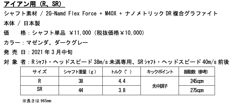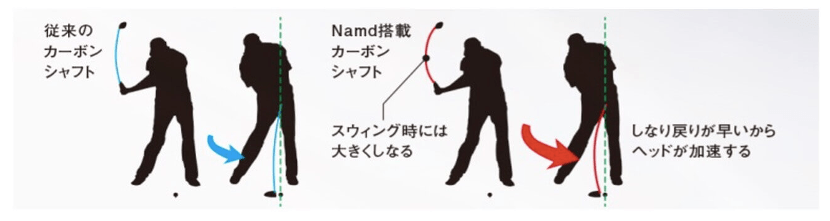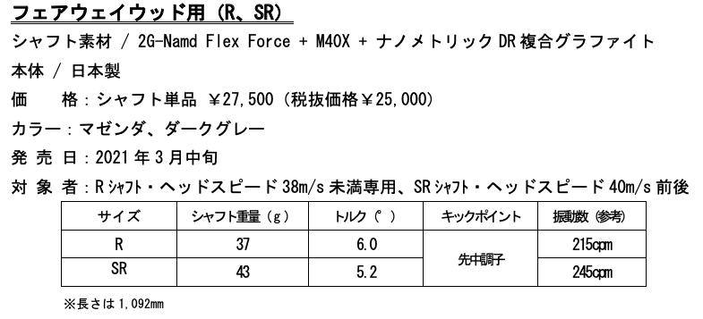 また、従来の軽量シャフトを継承したウッド・アイアン用のカスタムシャフトは、新次元カーボン「Namd(エヌアムド)※3」を進化させた「2G-Namd Flex Force」を中心部に採用することで強靭なしなりと復元力によりヘッドスピードをアップ。