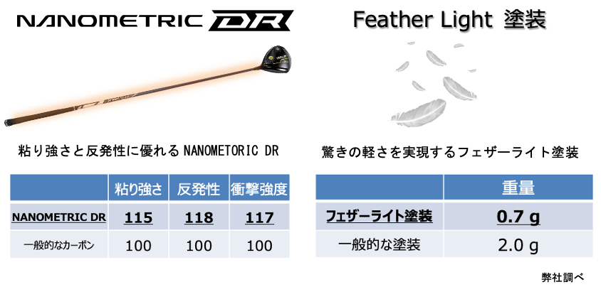 従来のシャフトより、さらに粘り強さと反発性能を両立したカーボン素材「ナノメトリックDR※2」を全長に複合し、シャフト全体の一体感と自然な弾き感をアップ。また軽量化を追求したフェザーライト塗装で、驚きの軽さ27.5g(世界最軽量※1)に強さを兼ね備え、インパクトスピードを高めます。