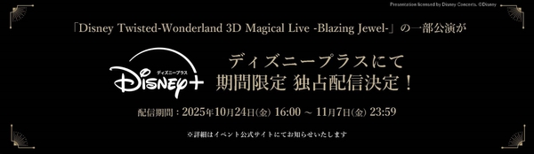 「Disney Twisted-Wonderland 3D Magical Live -Blazing Jewel-」の一部公演を期間限定で「Disney+(ディズニープラス)」にて独占配信することが決定いたしました。