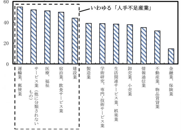 企業の人手不足は、企業の事業規模だけでなく業界によってもばらつきがあります。