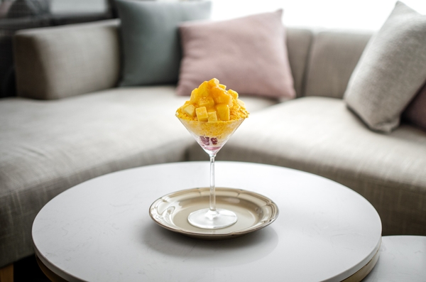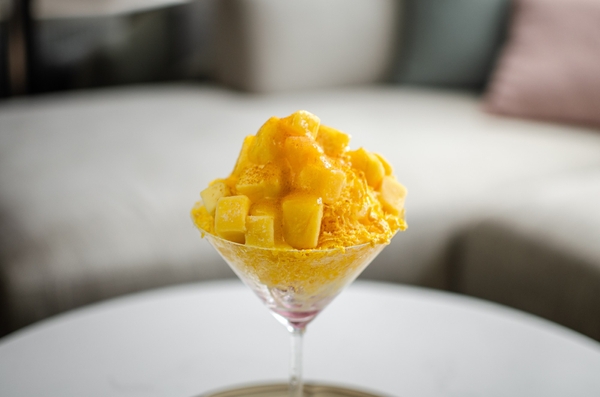 濃厚なマンゴーのかき氷に、シナモンとカルダモンのスパイスをミックスし、エキゾチックで大人な味わいに仕上げました。トップにはフレッシュなマンゴーを飾り、甘酸っぱいカシスムースがトロピカルな風味に爽やかなアクセントを加えます。